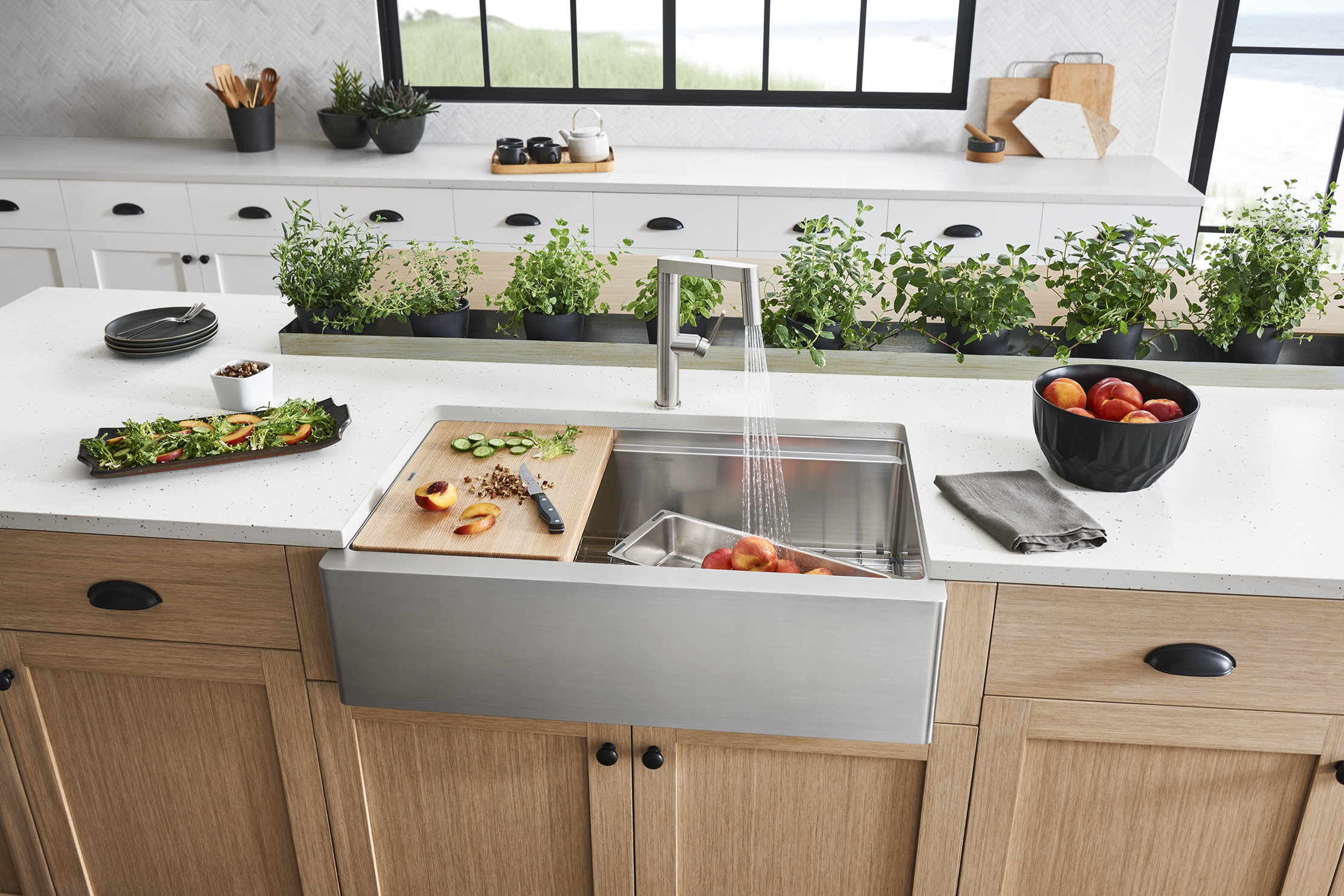 kitchen sink with cutting board and colander